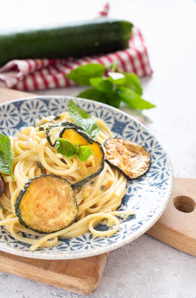 Au fur et à mesure que vous cuisez les courgettes, salez-les et ajoutez du basilic déchiré à la main. Plongez les pâtes dans l’eau bouillante légèrement salée, faites chauffer un peu d’huile avec une gousse d’ail et ajoutez les courgettes, versez un peu d’eau de cuisson pour les assouplir. Après environ 6 minutes de cuisson des spaghettis (moi j’ai utilisé des linguine), égouttez-les et versez-les dans la poêle avec les courgettes, en veillant à conserver un peu d’eau de cuisson.