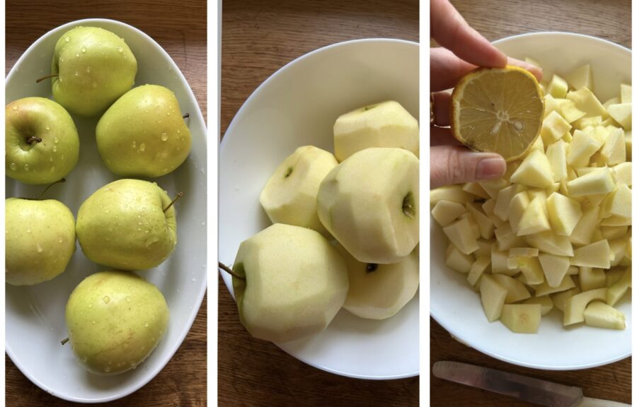 Pour faire le strudel aux pommes avec pâte feuilletée, lavez les pommes, épluchez-les, enlevez le trognon et coupez-les en quartiers. Idéalement utilisez des reinettes, mais au final celles que vous avez à la maison conviennent aussi : étant un dessert simple, on se débrouille avec ce qu’on a.