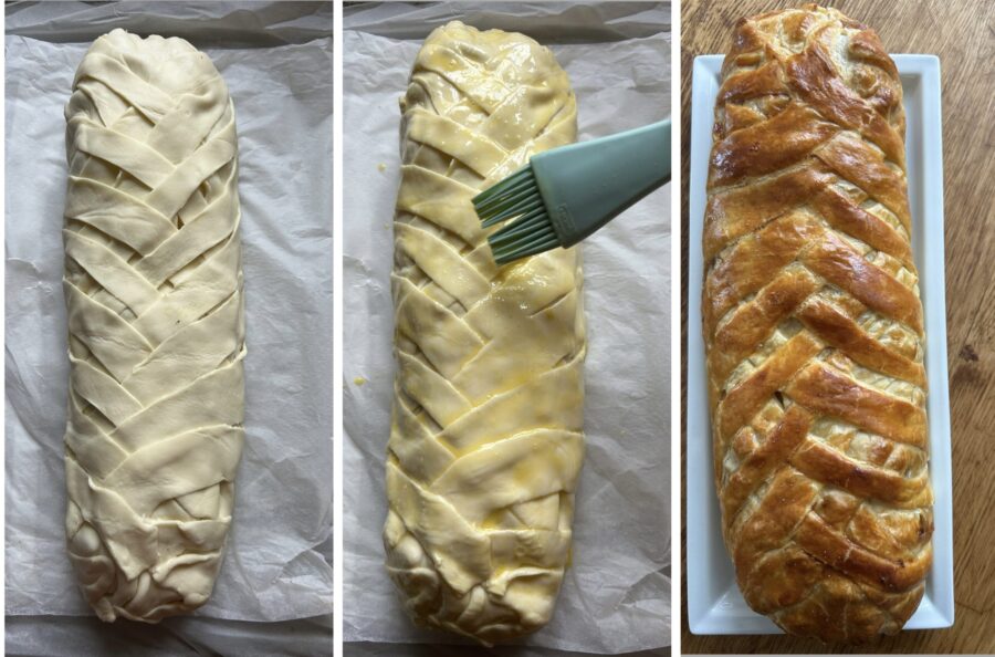 posez le cylindre sur le disque de pâte, découpez les côtés en forme d’arêtes de poisson et croisez-les sur le dessus, formant une tresse.
