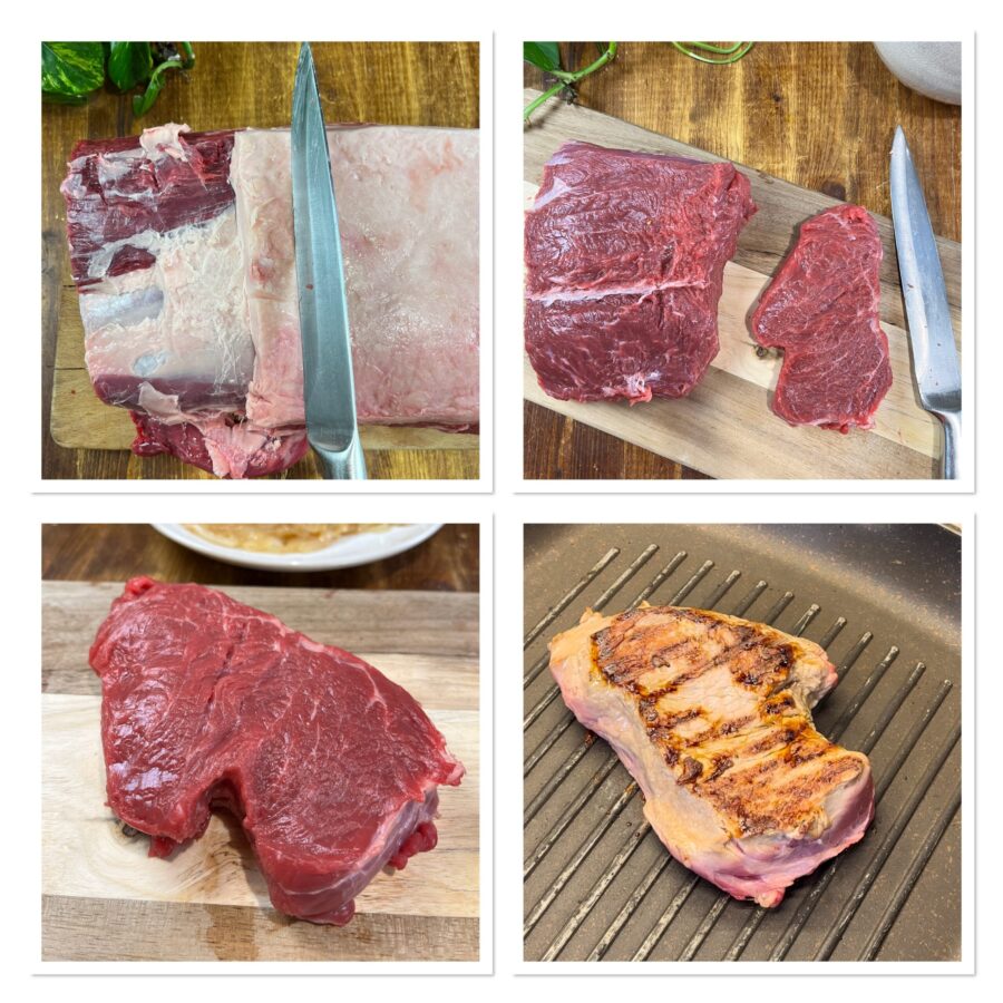 Pour préparer la tagliata de bœuf, sortez le morceau de contre-filet du frigo au moins une heure avant de le cuire. Si vous n’avez pas déjà les deux tranches de 400 g préparées par le boucher, procédez comme indiqué sur les photos. Retirez les parties grasses qui pourraient se trouver en surface, puis divisez le morceau en tranches d’environ 3–4 cm d’épaisseur.