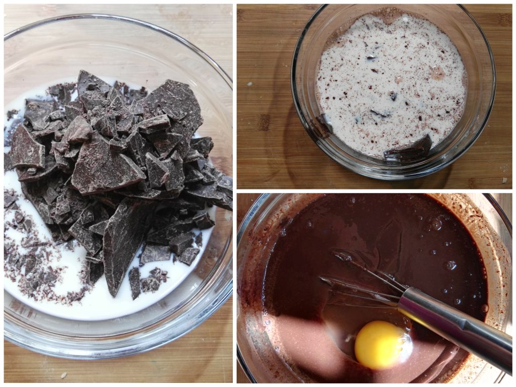 • Portez le lait à frôler l’ébullition, ajoutez le chocolat et mélangez jusqu’à ce qu’il soit entièrement fondu, ajoutez un œuf et attendez que la préparation tiédisse.