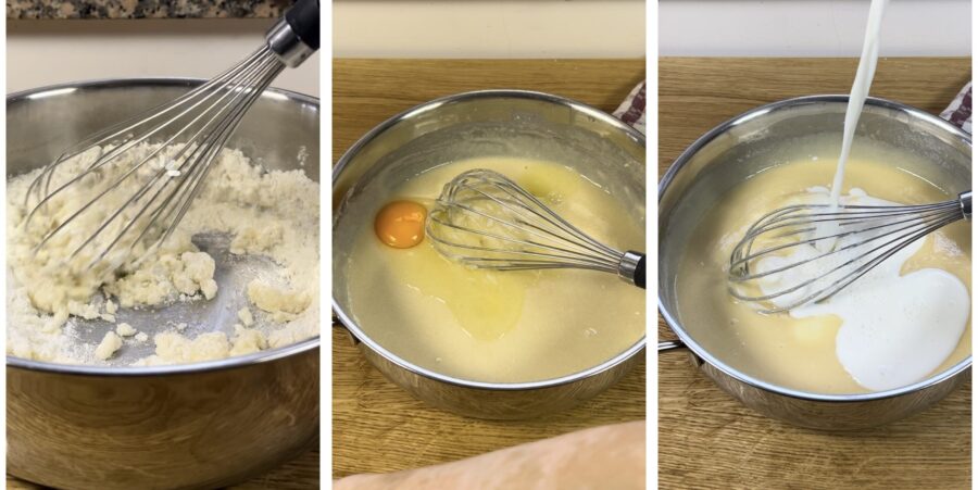 • (rapidement pour éviter les grumeaux), ajoutez l’œuf et le reste du lait. Travaillez rapidement au fouet pour obtenir un mélange fluide et sans grumeaux.