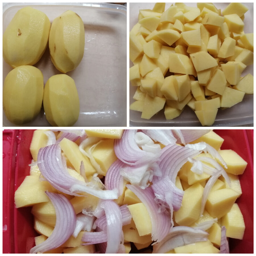 – Lavez-les, épluchez-les, coupez-les en morceaux et émincez l’oignon, mettez le tout dans un bol en verre ou en céramique, ajoutez un peu d’eau, couvrez avec une assiette ou n’importe quoi qui limite la sortie de la vapeur et faites cuire au micro-ondes pendant 15 minutes (une méthode sûre que j’ai testée plusieurs fois).