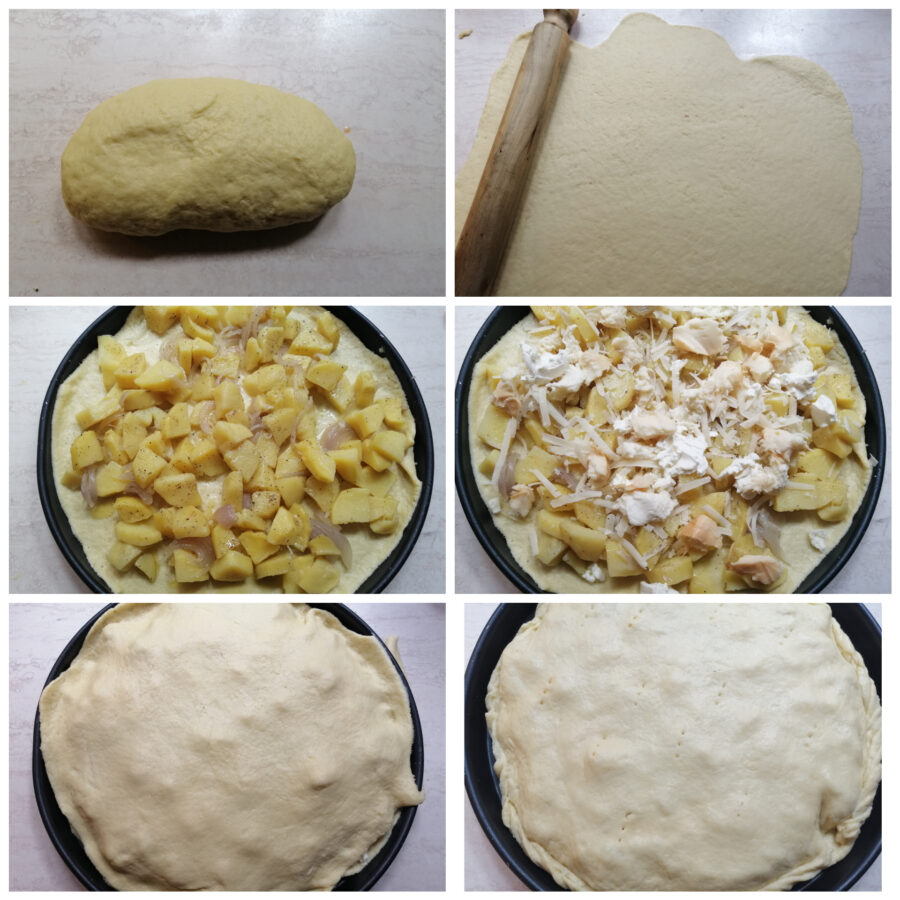 Pour réaliser la tarte salée avec pâte matta j’ai précuit les pommes de terre au micro-ondes, mais si vous n’en avez pas vous pouvez simplement les cuire à la poêle. Parmi les fromages que j’ai utilisés, la provola fumée mérite une place d’honneur ; je vous recommande vivement de l’utiliser. Pour le reste, tout autre type de fromage que vous aurez à ajouter conviendra.
