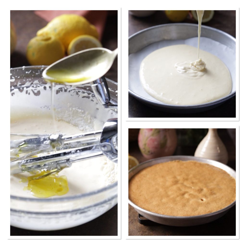 Coupez la génoise en 2 disques. Disposez le premier disque dans le moule que vous avez utilisé pour la cuisson, posé sur un disque de papier cuisson, et imbibez-le avec la moitié du sirop préparé en mélangeant eau et limoncello, ou eau et liqueur Strega. Versez un peu plus de la moitié de la crème de ricotta sur la génoise.