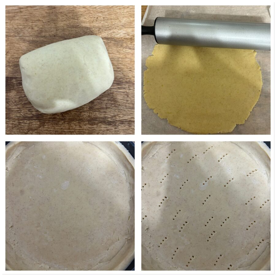 • Reprenez la pâte sablée, étalez-la sur une épaisseur d’environ un demi-centimètre et foncez un moule à charnière de 22 cm.