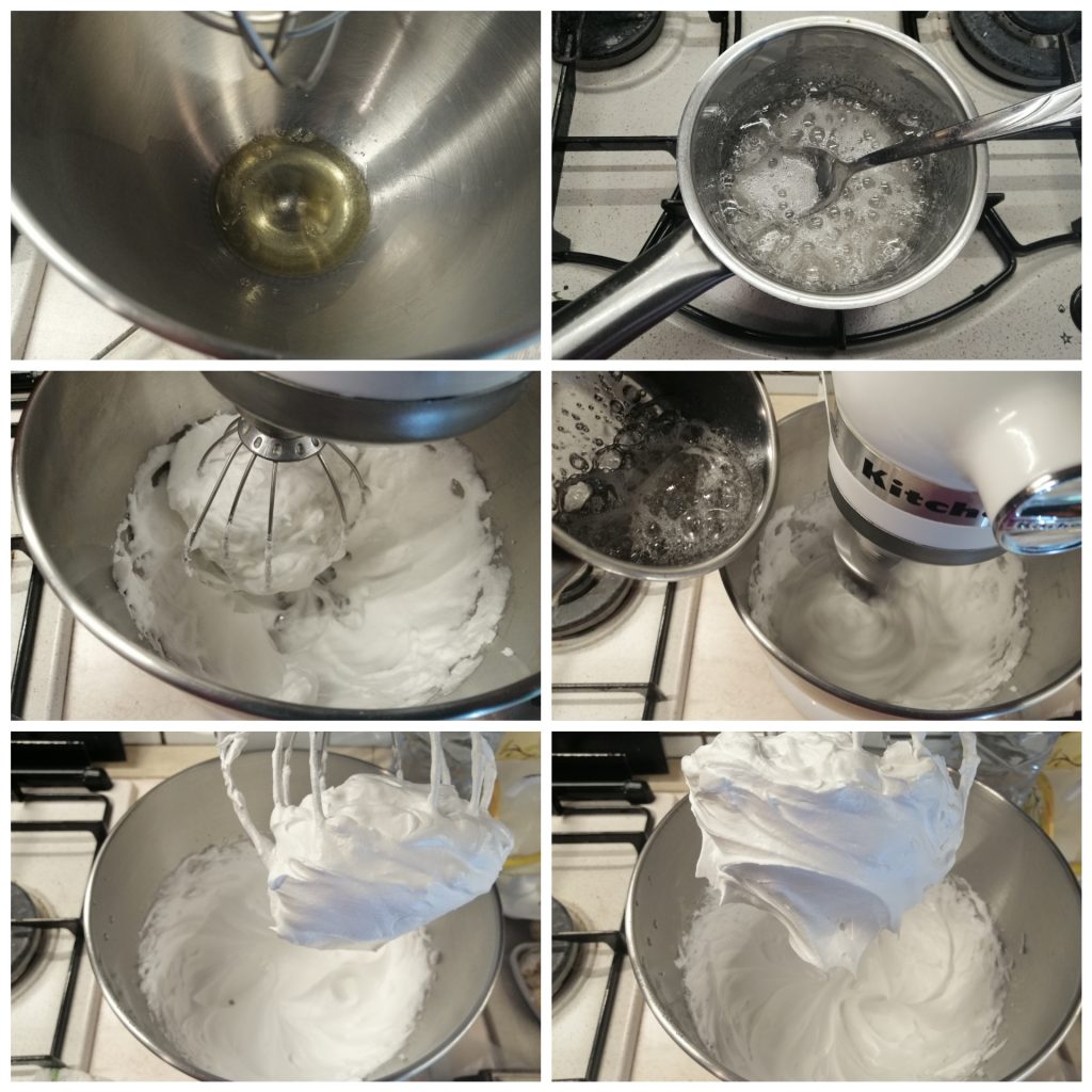 • Commencez par porter à ébullition à feu doux l’eau et le sucre ; vous devriez atteindre 121°C. En alternative, si vous n’avez pas de thermomètre, une fois l’ébullition atteinte poursuivez la cuisson 3-4 minutes, mais sachez qu’une température de 121°C vous garantira une meringue stable pendant plus d’une journée.