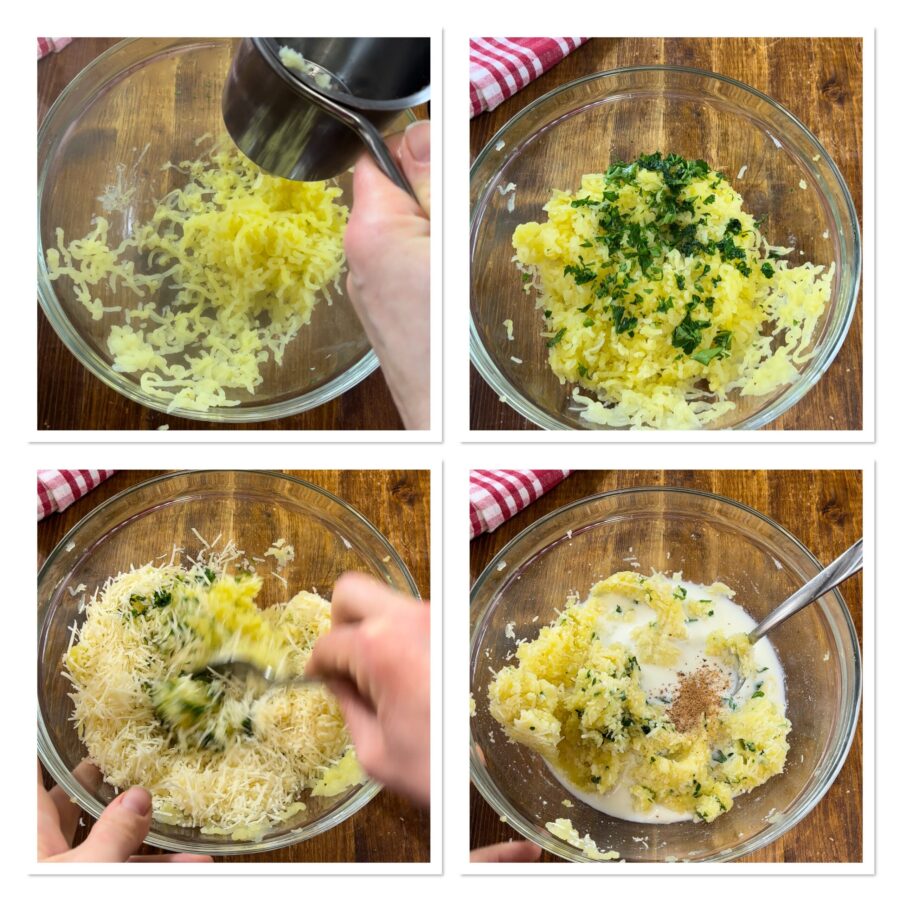 Épluchez les pommes de terre et écrasez-les avec un presse-purée pendant qu’elles sont encore chaudes, ajoutez du persil haché, du sel, du parmesan et mélangez, ajoutez le lait, la muscade et amalgamez jusqu’à obtenir une préparation homogène.