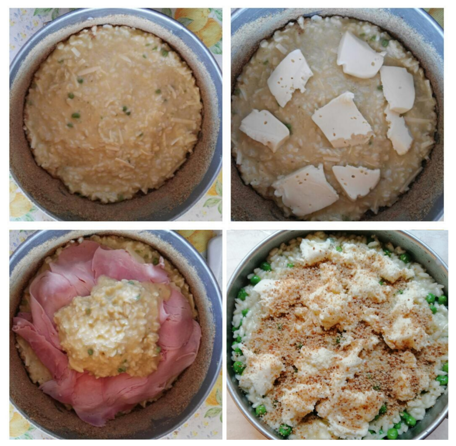 Huilez-le et saupoudrez-le de chapelure. Versez la moitié du mélange riz–œufs, étalez presque toute la mozzarella et le jambon, recouvrez du riz restant et encore un peu de mozzarella. Versez un trait d’huile et, avec un pinceau de cuisine, essayez de le répartir uniformément. Saupoudrez d’un peu plus de chapelure et du reste de grana.