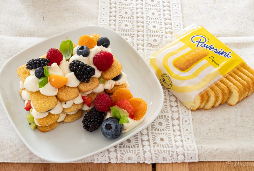Les couches rappellent celles du tiramisù original, l’ingrédient fondamental ici sont donc les Pavesini, alternés avec des touffes de crème et des dés de fruits. Le résultat est un dessert spectaculaire, facile à préparer et parfait à apporter à table quand on a envie de quelque chose de gourmand mais pas trop lourd.