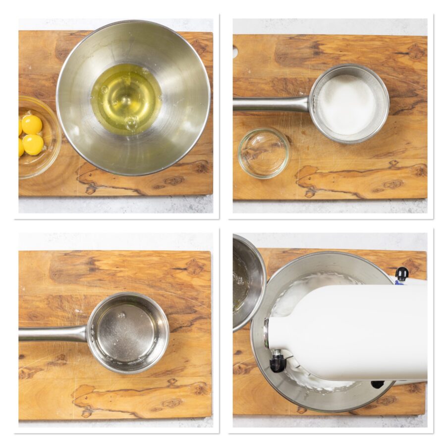 • Pour faire la crème du tiramisu, utilisez des œufs à température ambiante. Séparez les blancs des jaunes, commencez à monter les blancs en neige ferme, portez à ébullition une casserole avec 60 g de sucre et 25 g d’eau, mélangez souvent et dès que vous obtenez un sirop limpide, versez-le encore bouillant en filet sur les blancs. Le tout pendant que le robot continue de tourner rapidement. (Idéalement, vérifiez que la température du sirop a atteint 121°C, pour cette raison, disposer d’un bon thermomètre de cuisine est utile).