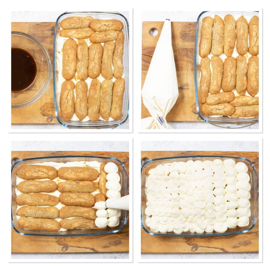• Réalisez encore une couche de biscuits imbibés de café, remplissez une poche à douille avec la crème au mascarpone restante et réalisez de nombreux petits choux de crème afin de les recouvrir de manière uniforme.