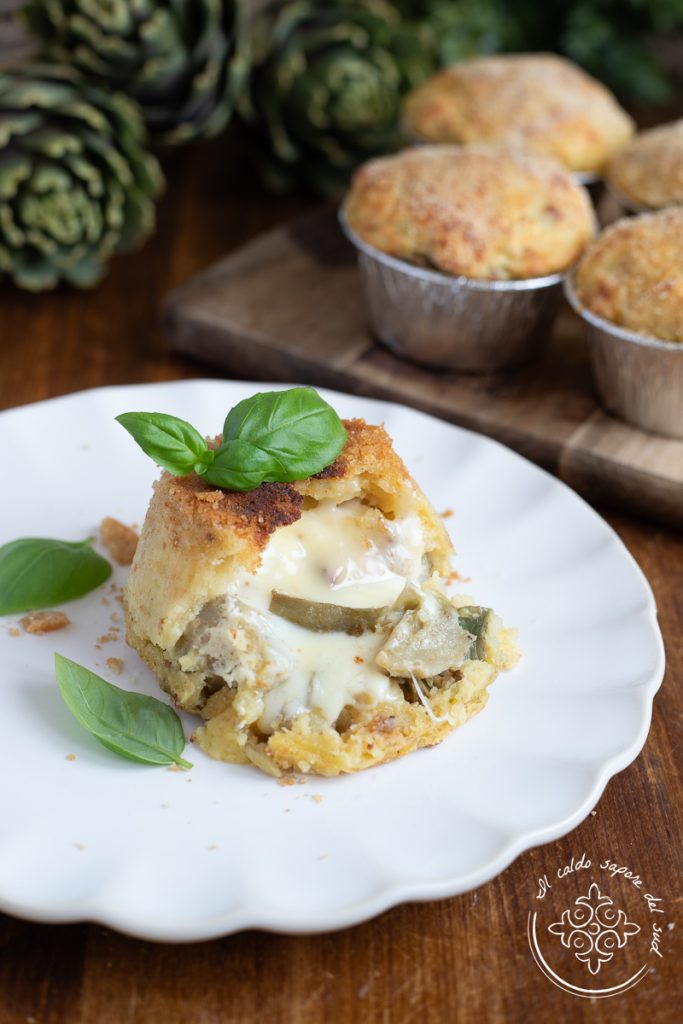Tortino de pommes de terre et artichauts, un plat principal et une entrée végétarienne, facile, savoureux et économique. Nous avons fait beaucoup de tortini de pommes de terre , vous vous souvenez par exemple des tortini de pommes de terre et brocolis ou des tortini de pommes de terre et épinards ? Sans parler des tortini de pommes de terre à la mortadelle et fromage et des tortini aux champignons, tous sûrement top, mais aujourd’hui je veux vous proposer une version printanière et végétarienne avec de cœurs d’artichaut et du fromage, voici les tortini de pommes de terre aux artichauts ! Les artichauts sont présents dans beaucoup de mes recettes, de la pâtes à la sauce d’artichauts au filet de poulet aux artichauts, sans oublier les omelettes comme la OMELETTE AUX ARTICHAUTS FACILE ET GOURMANDE, mais aujourd’hui j’avais envie d’une recette encore plus gourmande et j’ai décidé de préparer ces délicieux tortini aux cœurs d’artichaut, tout moelleux et irrésistibles. Ce sont des tortini individuels rapides à faire, esthétiques et savoureux, parfaits aussi pour un menu végétarien ou pour le menu de Pâques et le lundi de Pâques. Prêts à filer en cuisine pour les refaire avec moi ? Allons-y, mais avant de nous mettre aux fourneaux je vous rappelle que si vous voulez rester au courant de toutes mes recettes, vous pouvez suivre ma page Facebook (ici) et mon profil Instagram (ici)