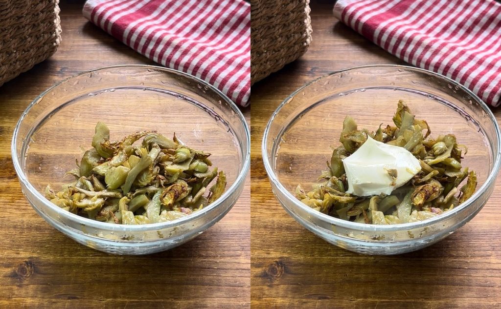 ajoutez les cœurs, salez et faites cuire environ dix minutes à feu doux, sans ajouter d’eau sauf si c’est vraiment nécessaire. Une fois assaisonnés, dorés et cuits, retirez l’ail et mettez-les dans un saladier.