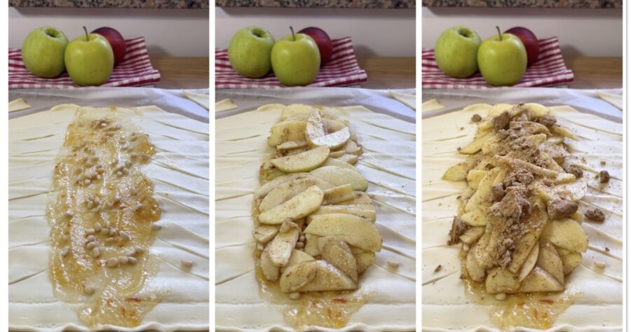 La tresse en pâte feuilletée aux pommes est un dessert aux pommes simple et rapide, très gourmand, comparable aux beignets aux pommes ou au gâteau entièrement aux pommes. Ce dessert s’inspire du strudel aux pommes, mais il est plus simple tant pour la garniture que pour la base en pâte feuilletée, ce qui en fait une recette pratique, idéale même pour les moins expérimentés en cuisine. En vous servirez votre tresse aux pommes en pâte feuilletée, à déguster chaude, tiède ou à température ambiante. La finition tressée donne en plus à ce dessert un côté raffiné et élégant, pour faire bonne impression sans effort ! J’ai enrichi ma tresse feuilletée aux pommes et à la cannelle avec des pignons, mais vous pouvez les remplacer par des éclats d’amande ou d’autres fruits secs, ou ajouter des morceaux de chocolat noir ou des raisins secs. Servez ce gâteau tiède accompagné d’une portion de crème pâtissière ou d’une glace à la crème et vous verrez le résultat ; ce dessert se déguste aussi froid et est excellent même le lendemain. Allons en cuisine maintenant, mais avant de découvrir notre recette de pâte feuilletée et pommes, je vous invite à jeter un œil à mon spécial dédié aux desserts aux pommes : toutes les recettes et je vous rappelle que si vous voulez rester informé de toutes mes recettes, vous pouvez suivre ma page Facebook (ici) et mon profil Instagram (ici).