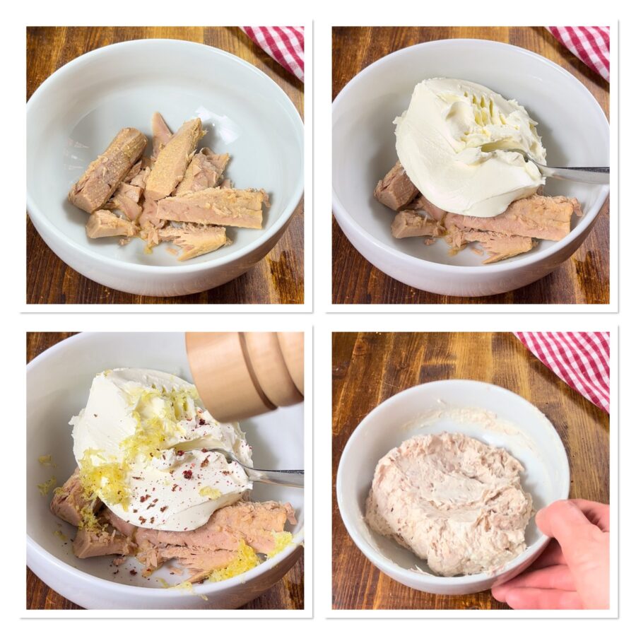 Pour préparer les truffettes salées au thon, égouttez le thon et mettez-le dans un bol avec le fromage à tartiner, le zeste de citron, le jus d’un demi-citron et le poivre rose moulu.