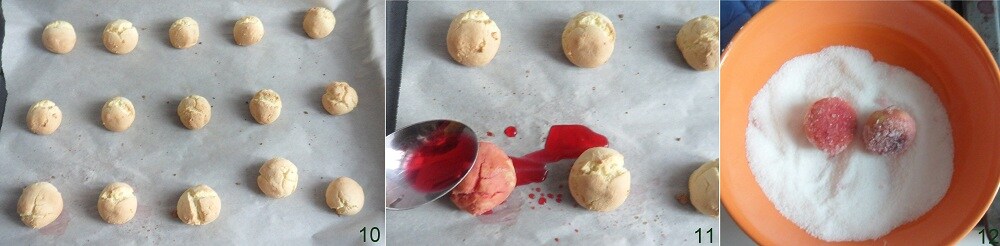 Lorsque les castagnoles au four sont cuites (10), sortez-les du four et laissez-les refroidir. Imbibez-les rapidement avec le sirop (11) (vous pouvez les y plonger, mais veillez à ne pas trop les imbiber sinon elles se casseront), puis passez-les immédiatement dans un bol avec du sucre semoule (12), de manière à les couvrir entièrement.