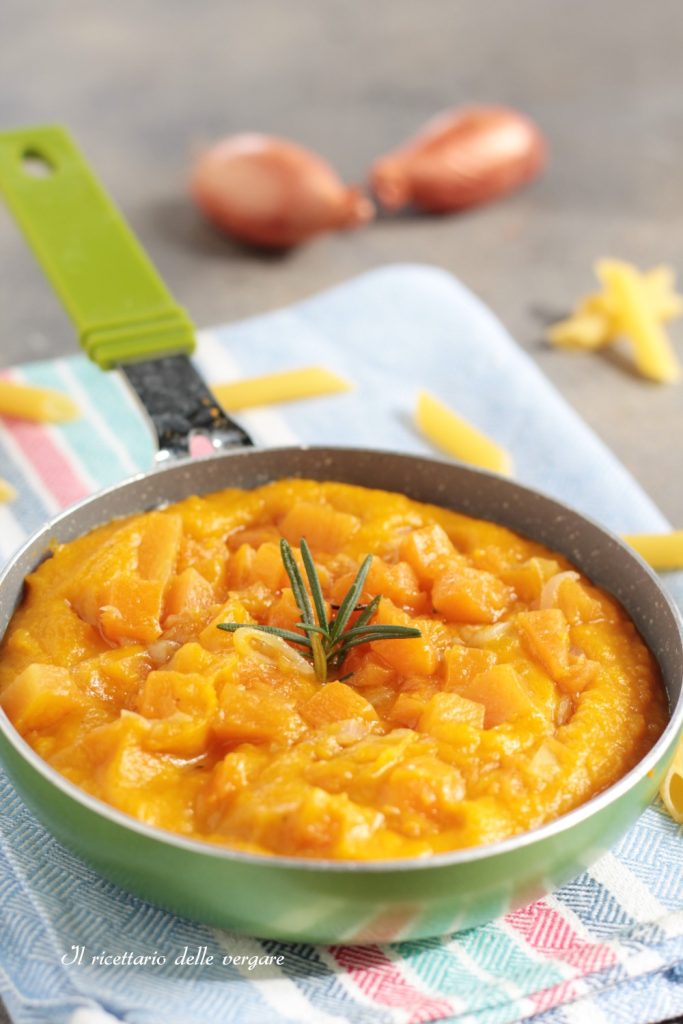 C’est le moment crucial pour la texture du plat. Éteignez le feu et retirez le brin de romarin. Prélevez environ la moitié du potiron et transférez-la dans le bol du mixeur plongeant avec un peu d’eau de cuisson. Mixez à pleine vitesse jusqu’à obtenir une structure lisse et brillante, puis remettez-la dans la poêle avec les dés restants : vous obtiendrez une base très crémeuse avec le cœur du potiron encore en morceaux.La touche finale