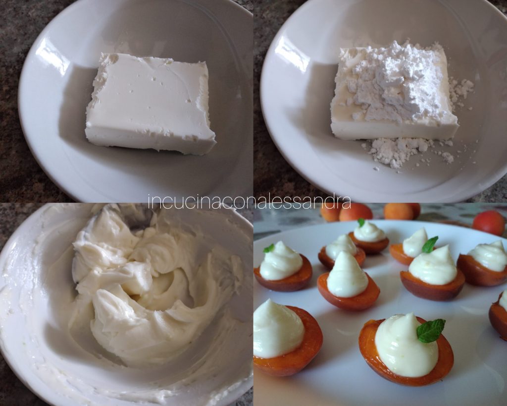 Tout d’abord, choisissez des abricots mûrs, lavez-les bien, séchez-les avec du papier absorbant et coupez-les en deux en retirant les noyaux. Prenez une plaque de cuisson, couvrez-la de papier cuisson et disposez-y les abricots coupés, saupoudrez-les de sucre et enfournez-les dans le four chaud à 180° pendant 10 minutes. Considérez qu’ils doivent s’assouplir et non cuire complètement. Mes abricots n’étaient pas très gros, si vous trouvez des gros, laissez-les peut-être 2/3 minutes de plus. Une fois prêts, laissez-les refroidir. Quand ils sont froids, préparez la garniture : dans une petite coupelle, mettez le fromage à tartiner et le mascarpone avec le sucre glace, mélangez bien jusqu’à obtenir une crème homogène. Ajoutez une pincée de zeste de citron râpé, juste un peu, mélangez et mettez la crème dans une poche à douille sans embout. Prenez un plat de service, mettez-y les abricots et garnissez-les avec la crème préparée. Avant de servir, ajoutez quelques feuilles de menthe pour donner de la couleur.