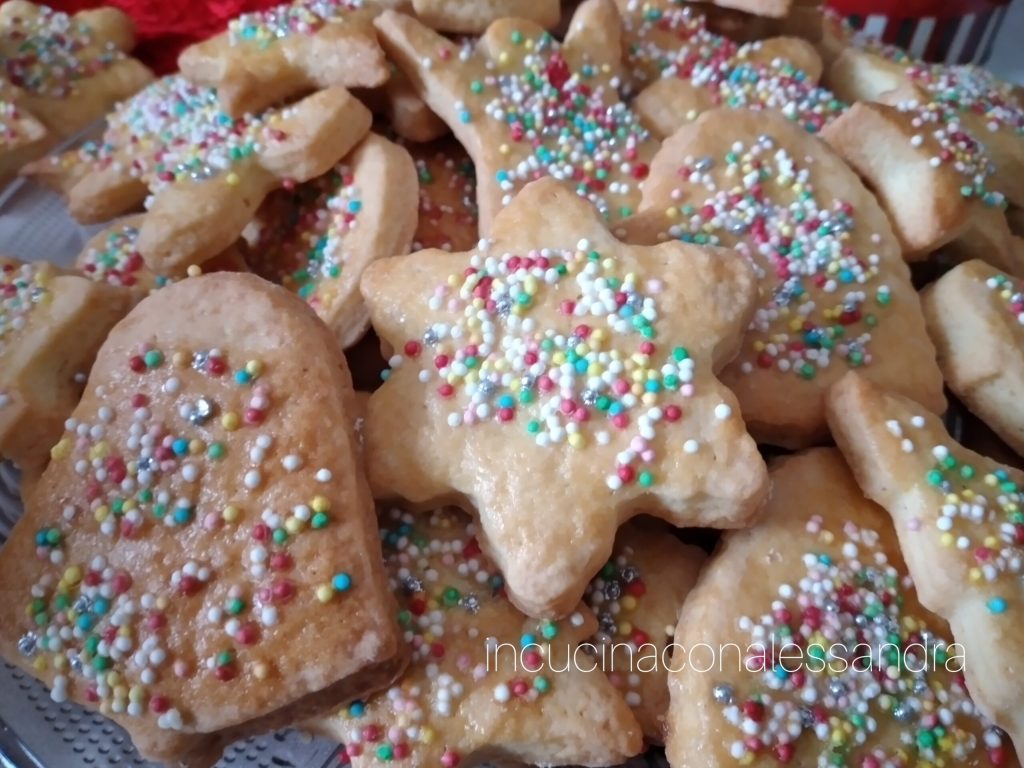 Disposer la farine, tamisée avec la levure, en fontaine. Verser au centre les œufs, le sucre et commencer à pétrir, ajouter ensuite le beurre fondu tiédi, continuer à pétrir en ajoutant petit à petit les autres ingrédients, cela doit devenir une pâte type sablée, lisse et homogène. Diviser la pâte et l’étaler avec un rouleau à pâtisserie, faire une épaisseur de un demi-centimètre. Prenez les emporte-pièces (s’ils sont de Noël c’est mieux) et coupez la pâte pour former les biscuits, placer sur une plaque avec du papier sulfurisé. Avec le jaune d’œuf battu, badigeonner les biscuits et décorer avec les grains colorés. Mettre au four et cuire environ 10/12 minutes à 180