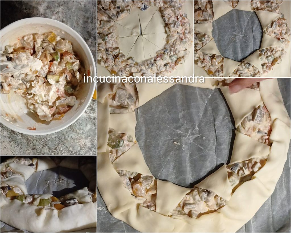 Tout d’abord bien laver et nettoyer les légumes, puis sur une planche les couper en dés et hacher finement l’oignon. Dans une poêle, faire revenir avec un filet d’huile l’oignon puis ajouter les légumes coupés en dés, saler, poivrer, bien mélanger et faire dorer une minute, puis cuire à feu doux avec un couvercle, si nécessaire ajouter un peu d’eau. Les légumes doivent être al dente, une fois prêts, laisser tiédir un peu, lorsqu’ils sont un peu refroidis, ajouter la ricotta et bien mélanger, ajuster le sel. Prendre la pâte, l’étaler, prendre les légumes et farcir la pâte, en partant de l’extérieur en laissant environ 2 cm libres, vous devez faire un cercle comme vous le voyez sur les photos, lorsque vous avez fini de farcir, avec un couteau couper au centre de la pâte en faisant 8 rectangles, couper d’abord en 4 puis diviser encore la pâte, prendre la pointe de chaque triangle et tirer vers l’extérieur au-dessus des légumes, puis faire la même chose avec la pâte restante à l’extérieur, la mettre sur les légumes de l’extérieur vers l’intérieur. Avec un pinceau de cuisine badigeonner la pâte avec du lait ou avec du jaune d’œuf battu. Enfourner dans le four chaud avec son papier sulfurisé et cuire à 180° pendant environ 18/20 minutes ou jusqu’à la dorure souhaitée. Lorsqu’elle est prête, dresser sur une assiette ou une planche ronde, si vous voulez la mettre en centre de table, décorer avec des boules et un ruban pour faire un nœud.