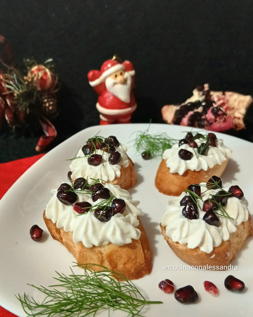 Les crostini de Noël ricotta et grenade sont une entrée fraîche et légère, crémeuse et très appétissante, croquante à l’extérieur, moelleuse et crémeuse au centre, colorée par les grains rouges, idéale pour les fêtes de Noël, une entrée au goût décidément automnal que vous pouvez facilement préparer pour toute occasion.