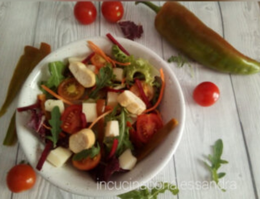 Une grande salade rustique et riche, très fraîche, appétissante et surtout savoureuse, très facile et rapide à préparer. Elle est tellement riche qu’on peut la considérer comme un plat unique, du moins pour moi. Parfaite à emmener à la plage, mais aussi au travail, pour le déjeuner.