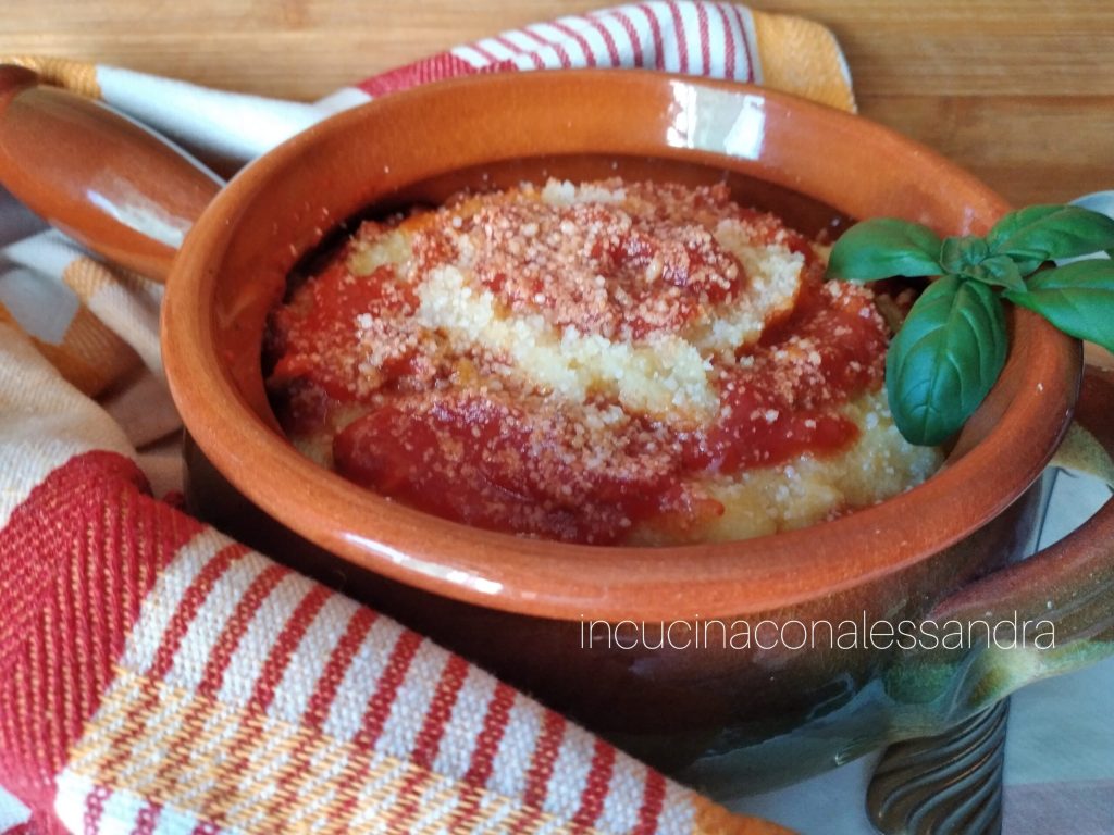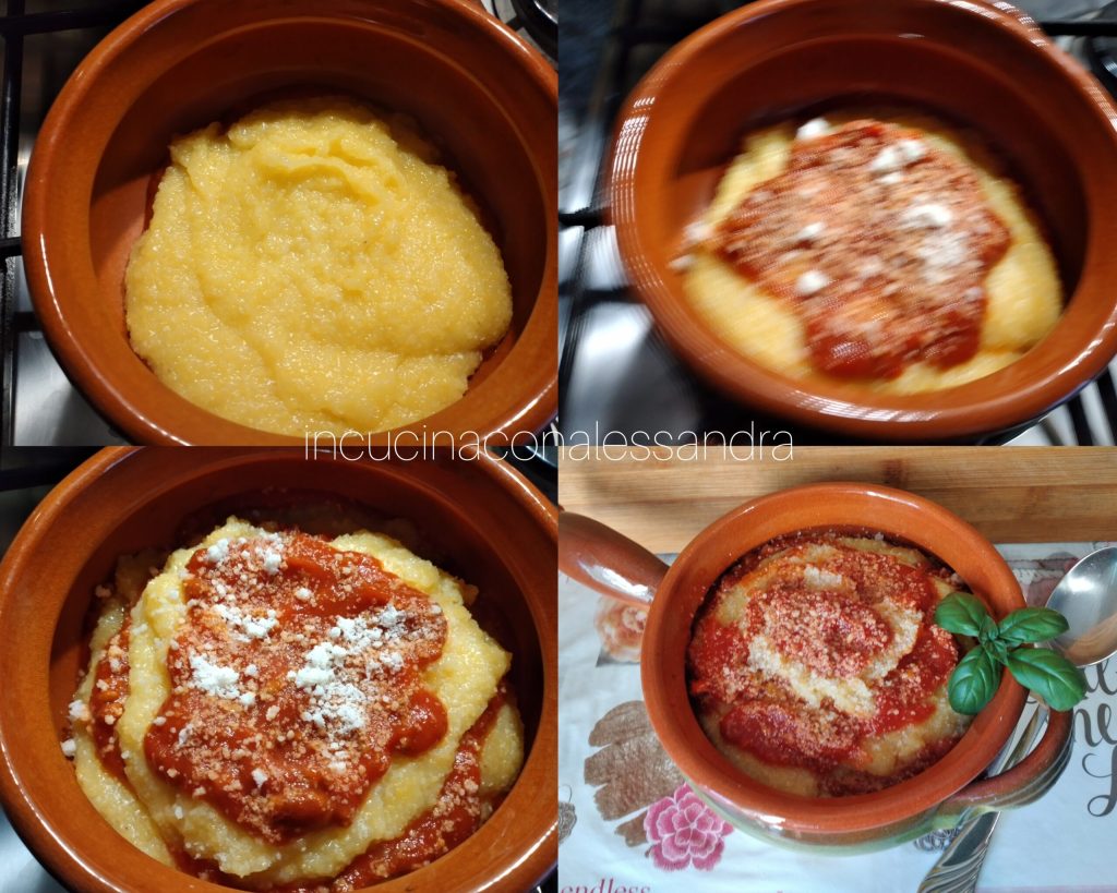 Quand le ragoût est à mi-cuisson, préparez la polenta, dans une grande casserole mettre l’eau et porter à ébullition, puis ajouter le sel et 2 cuillères à soupe d’huile qui aidera à éviter les grumeaux, verser en pluie la farine de maïs en mélangeant continuellement avec une cuillère ou un fouet. Cuire à feu très doux en remuant continuellement pendant le temps de votre farine indiqué sur l’emballage, considérer que pour les matuffi la polenta doit être douce et lisse et ne doit pas durcir, donc si nécessaire ajouter un peu d’eau. Quand elle est prête, prendre les assiettes et mettre une cuillère de ragoût, puis une louche de polenta, encore du ragoût avec une pincée de parmesan, encore de la polenta et à nouveau du ragoût et du parmesan jusqu’à atteindre les couches que vous voulez, moi en général j’en fais 3. Pour la dernière couche, mettez beaucoup de ragoût et de parmesan, vous pouvez mettre aussi un filet d’huile si vous aimez. Les matuffi sont prêts à être servis à table.