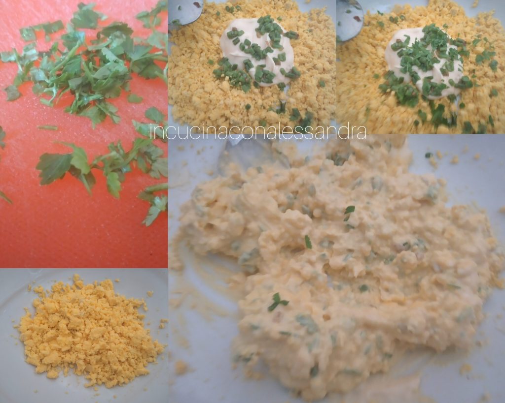 J’ai lavé les œufs parce qu’ils viennent de mes poules, en tout cas si vous les lavez c’est mieux car ils doivent être bouillis et parfois la coquille se casse, les mettre dans une casserole avec de l’eau froide et porter à ébullition et les faire bouillir pendant environ 6/7 minutes pour qu’ils durcissent, puis laissez-les refroidir dans de l’eau froide. Pendant ce temps, après avoir nettoyé et lavé les asperges, les blanchir quelques minutes dans de l’eau chaude, couper les asperges en petits morceaux en laissant la pointe plus grande, hacher un petit morceau d’oignon juste pour donner un peu plus de saveur et le faire revenir dans un filet d’huile, ajouter les asperges et les faire sauter quelques minutes en veillant à ce que les pointes ne se cassent pas. Quand les asperges sont cuites, mettre les pointes de côté. Retirer la coquille des œufs et les couper en deux, retirer le jaune de l’œuf blanc et laisser au moins un demi-jaune de côté, dans une assiette avec une fourchette, écraser les jaunes, ajouter les asperges préparées, la mayonnaise, je vais au pif, le persil haché, une pincée de sel et mélanger, saler le blanc et remplir avec le mélange préparé, émietter le jaune restant et saupoudrer sur chaque œuf, prendre les pointes des asperges et décorer les œufs, ajouter également quelques morceaux de persil, dresser et servir. Vous pouvez les préparer quelques heures à l’avance.