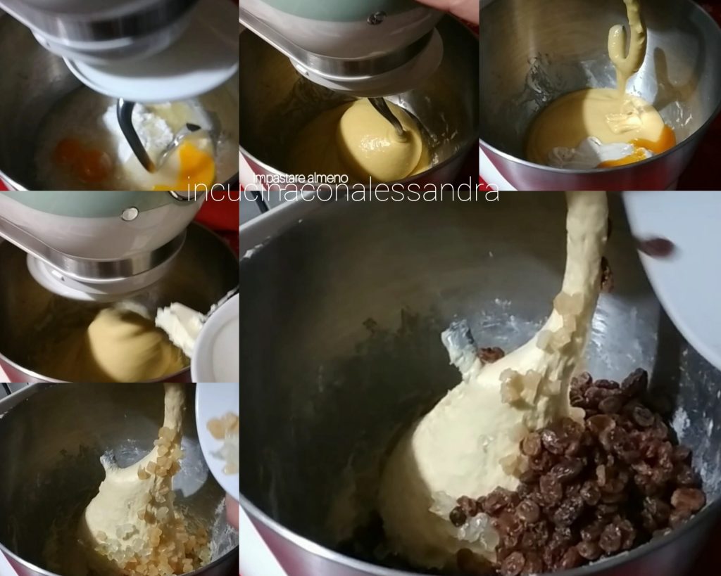 Dans le bol du robot, mettre les farines, le sucre, le sel, l’eau et les jaunes d’œufs, commencer à mélanger avec le crochet à vitesse 2 pendant 5 minutes, ajouter le levain doublé de volume et continuer à bien mélanger pendant 5 minutes. Ensuite, ajouter les arômes et bien mélanger pendant encore 5 minutes. À ce stade, ajouter petit à petit le beurre doux à température ambiante en mélangeant toujours à vitesse 2 jusqu’à ce qu’il soit complètement incorporé, cela prend environ 10 minutes, pour finir ajouter l’orange et le cédrat confits et les raisins secs égouttés et séchés, mélanger jusqu’à ce qu’ils soient bien incorporés. Beurrer le plan de travail et verser la pâte, soulever et plier la pâte au moins 10 fois, puis la mettre dans le bol du robot, couvrir avec un film plastique alimentaire et laisser lever toute la nuit dans le four éteint. Le lendemain matin, prendre la pâte et la verser sur le plan de travail fariné, diviser la pâte en 2 et refaire les pliages au moins 4 fois en essayant de former un pain, prendre les moules à panettone et placer la pâte à l’intérieur, couvrir à nouveau avec le film plastique et laisser lever dans le four éteint, avec la lampe allumée jusqu’à ce qu’elle atteigne le bord du moule. Une fois levé, faire une incision en croix sur le panettone soulever légèrement les côtés vers l’extérieur et mettre au centre 2 petits morceaux de beurre. Cuire dans le four chaud un à un à 180° pendant environ 45/50 minutes, placer sur l’étagère la plus basse du four, si cela semble trop foncé, couvrir le panettone avec une feuille d’aluminium, ne faites pas comme moi qui en ai presque brûlé un, et terminer la cuisson, toujours faire le test du cure-dent car d’un four à l’autre, la cuisson peut varier. Une fois prêts, percer le panettone avec les brochettes et le laisser refroidir à l’envers dans une casserole.