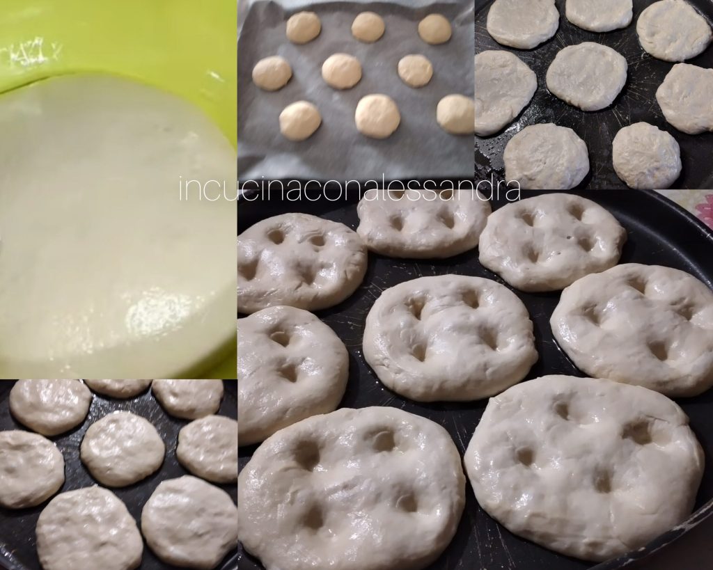 Dans une petite assiette avec le lait tiède, dissoudre la levure et le miel. Dans un grand bol ou sur un plan de travail, mettre la farine en fontaine. Si vous le faites sur un plan de travail, versez les liquides petit à petit, sinon dans le bol, versez le lait où vous avez dissous la levure, l’eau et l’huile et commencez à mélanger avec les mains ou avec l’aide d’une cuillère en bois. Quand ça commence à se mélanger, ajoutez le sel et commencez à pétrir puis continuez sur un plan de travail fariné. Dès que vous obtenez une pâte lisse et homogène, remettez-la dans le bol, couvrez-la avec un film plastique ou un torchon et laissez lever jusqu’à ce qu’elle double de volume. Une fois doublée, formez des boules et décidez de la taille en fonction de vos besoins, plus grandes ou plus petites. Couvrez avec un torchon et laissez lever encore un peu. Ensuite, reprenez les boules préparées, aplatissez-les un peu pour leur donner la forme des petits pains, mettez-les sur une plaque recouverte de papier sulfurisé, laissez lever à nouveau jusqu’à ce qu’elles doublent de volume. À ce moment, avec les doigts, faites les trous classiques des petits pains, badigeonnez avec un peu de lait et salez, enfournez dans le four chaud et faites cuire à 180° pendant environ 25 minutes ou jusqu’à la dorure souhaitée. Dès qu’ils sont cuits, badigeonnez-les rapidement avec très peu d’eau pour les rendre plus moelleux, mais si vous voulez les garnir, je vous conseille de ne pas trop les faire dorer, sinon ils s’ouvriront mal.
