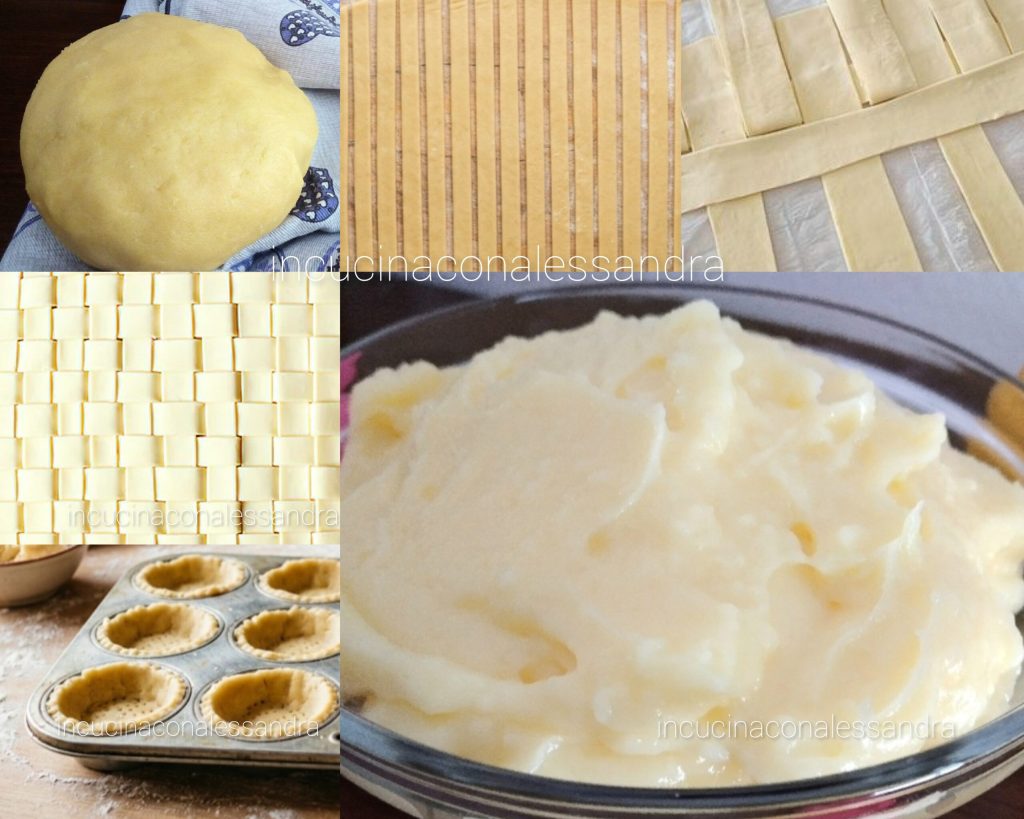 Dans un robot pâtissier, mettez la farine, le beurre, l’œuf, le sucre et la vanilline. Lancez à vitesse 2 jusqu’à ce que la pâte commence à se détacher des parois, puis terminez de mélanger à la main ; enveloppez la pâte dans un film alimentaire et placez-la au réfrigérateur pendant une demi-heure. Au bout de ce temps, déposez la pâte sur un plan de travail fariné et étalez-la au rouleau jusqu’à obtenir une épaisseur d’environ 0,5 cm. Découpez ensuite de nombreuses bandes avec une roulette ; prenez du papier cuisson et placez dessus la moitié des bandes, relevez les bandes une sur deux, placez perpendiculairement une bande, abaissez celles relevées et relevez les autres, ajoutez une nouvelle bande dans l’autre sens et continuez ainsi jusqu’à former une tresse. Prenez un emporte-pièce rond et découpez la pâte, puis disposez tous les cercles dans des moules beurrés et farinés, piquez le fond et faites cuire dans un four chaud à 180 °C pendant environ 8–10 minutes. Laissez-les refroidir une fois cuits. Quand la crème est froide, fouettez-la avec les fouets pour qu’elle devienne souple et veloutée. Garnissez vos petits paniers soit à la cuillère, soit avec une poche à douille ; pour finir, ajoutez les petits œufs colorés. J’ai mélangé les couleurs, mais vous pouvez faire chaque panier d’une seule couleur. Les paniers sont prêts à être servis.