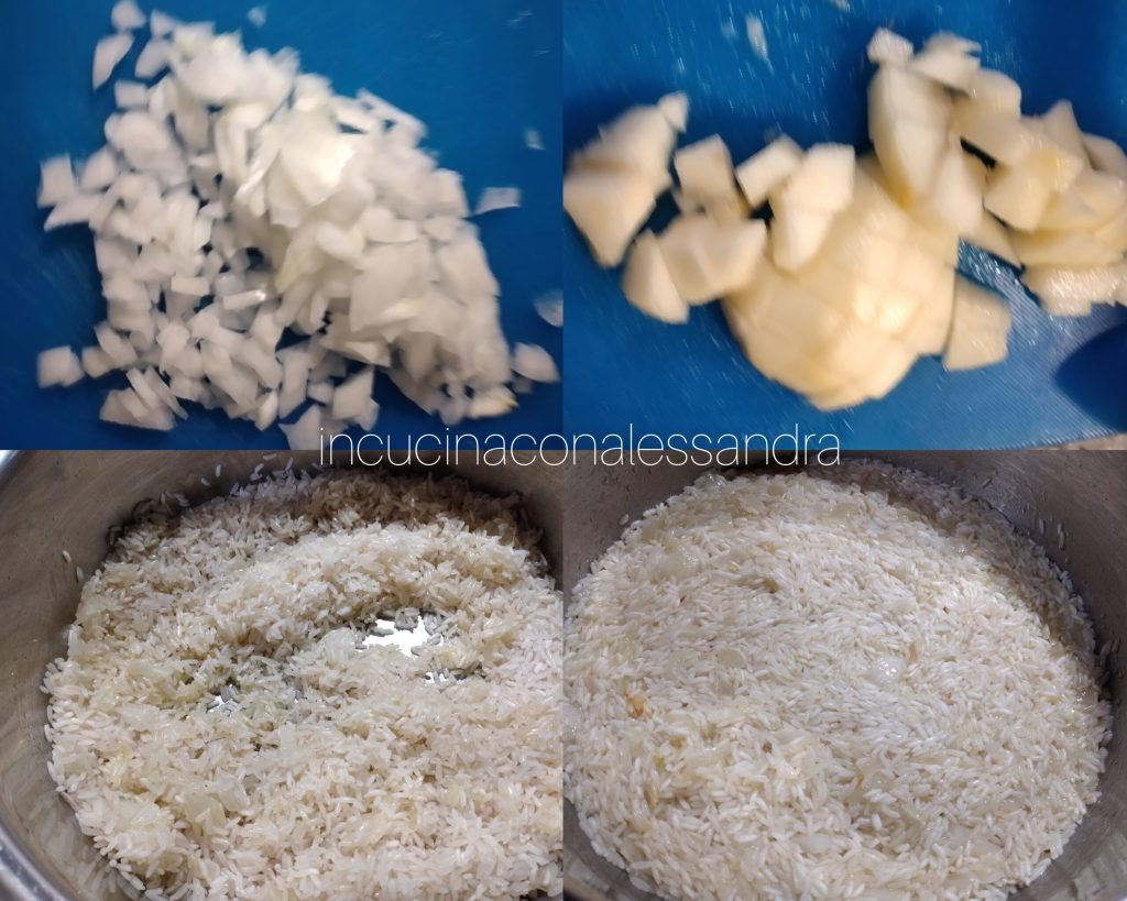 Avant tout, si vous ne l’avez pas déjà fait, préparez un bouillon de légumes en utilisant les légumes que vous avez, sinon, pour gagner du temps, préparez un bouillon avec un cube. Nettoyez l’oignon et hachez-le finement. Dans une casserole haute, mettez un filet d’huile et faites revenir l’oignon. Dès qu’il est doré, ajoutez le riz et faites-le bien griller. Lorsqu’il est grillé, déglacez avec le vin blanc, puis ajoutez progressivement le bouillon de légumes chaud. Pendant ce temps, lavez la poire et coupez-la en dés. Si vous n’aimez pas la peau, enlevez-la. À mi-cuisson du riz, ajoutez la poire et ajustez le sel, puis terminez la cuisson. Entre-temps, hachez quelques noix en petits morceaux, prenez une poire avec une peau plus verte si vous en avez pour donner une touche de couleur et coupez-en la moitié en petits dés. Si vous préférez un risotto plus riche, utilisez-la en entier. Lorsque le riz est prêt, incorporez le pecorino romano, une belle noix de beurre et la moitié des noix hachées. Servez avec une pincée de parmesan, quelques morceaux de poire et un peu de noix hachées. Votre risotto est prêt à être servi.