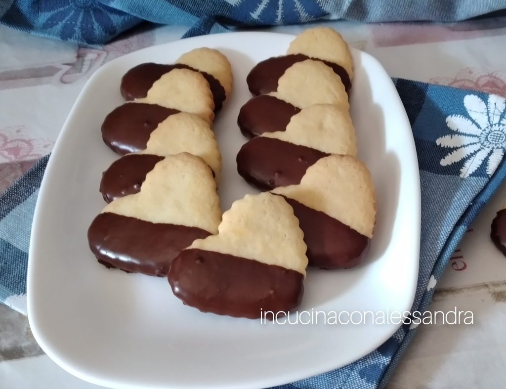 Dans une casserole mettez un petit bol avec le chocolat et faites fondre au bain-marie, quand il est prêt prenez les biscuits et trempez-les pour moitié dans le chocolat, placez les biscuits sur une grille surélevée et laissez-les refroidir. Dressez les biscuits.