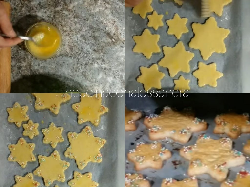 Prendre les emporte-pièces et découper la pâte, retirer l’excédent de pâte, la retravailler pour l’utiliser ensuite. Dans un petit bol, battre un œuf avec 2 cuillères à café de sucre, placer les biscuits sur une plaque recouverte de papier sulfurisé et badigeonner les biscuits avec l’œuf préparé, prendre les perles colorées et décorer toutes les pointes des biscuits, enfourner dans le four préchauffé et cuire à 180°C pendant environ 12 minutes ou jusqu’à la dorure désirée. Une fois prêts, laisser tiédir.