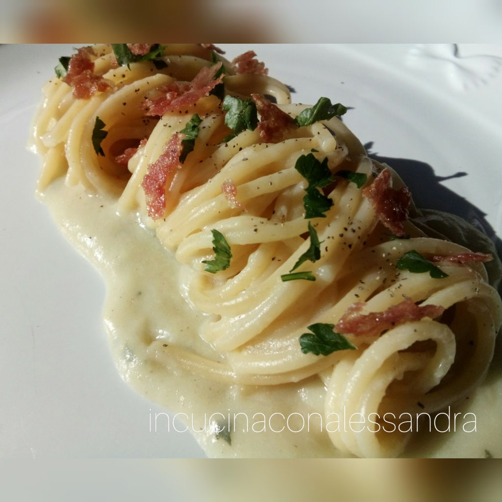 Spaghetti crème d’artichauts et speck, un plat splendide très savoureux.