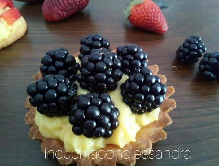 Une fois refroidies, couvrez la pâte sablée d’une couche de crème et ajoutez les mûres. Vous pouvez également saupoudrer de sucre glace.