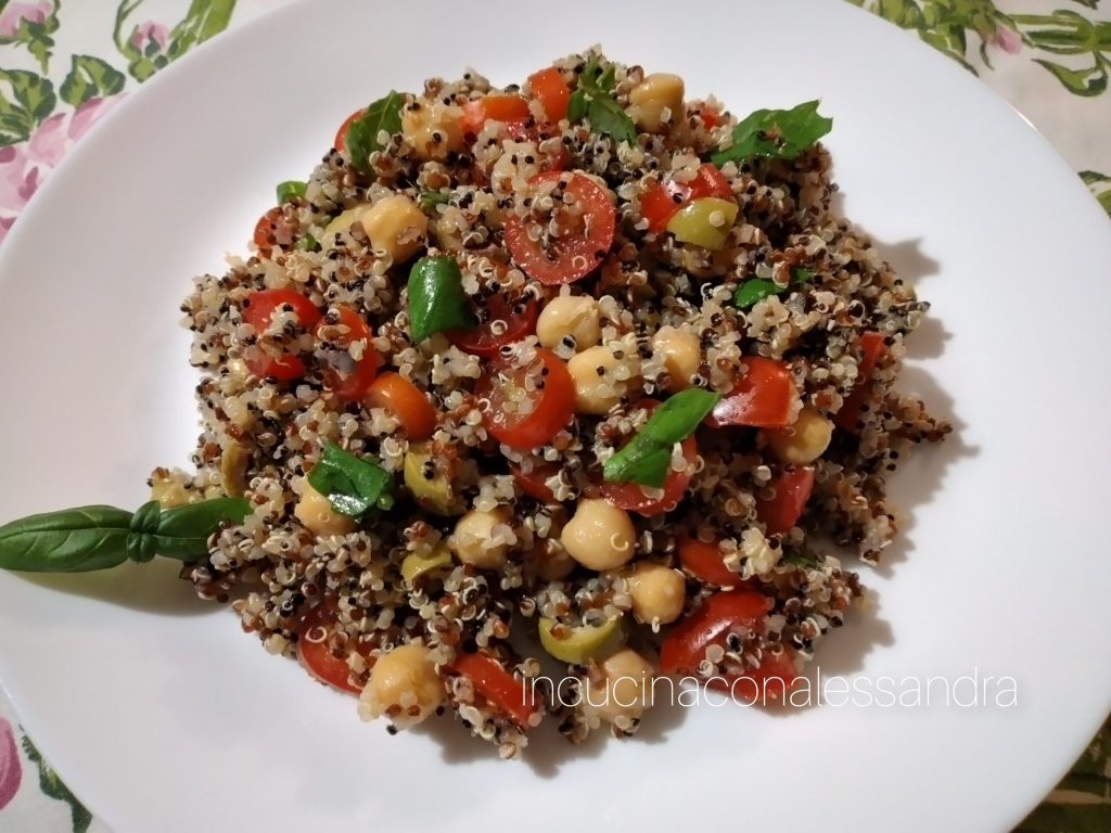 Le trio de quinoa tomates cerises et pois chiches est une salade simple, saine et légère, mais décidément savoureuse, à déguster chaude mais excellente aussi froide, parfaite pour le déjeuner au travail ou pour vos sorties en plein air.