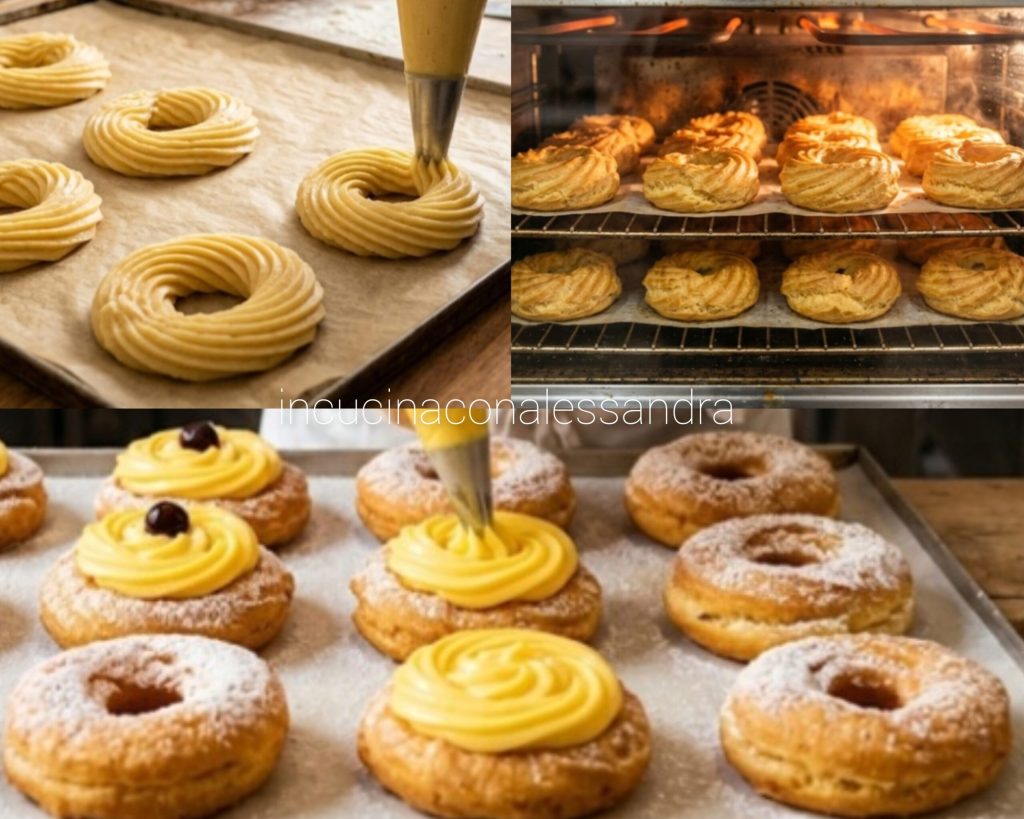 Tout d’abord, vous devez préparer la crème pâtissière et la laisser refroidir couverte d’un film plastique. Dans une casserole, portez l’eau à ébullition, ajoutez le beurre, le sucre et le sel. Retirez du feu, ajoutez la farine en une seule fois en remuant bien, remettez sur le feu et mélangez jusqu’à l’obtention d’un mélange homogène ; il sera prêt quand il commencera à se détacher des parois. Laissez refroidir, incorporez les œufs entiers et les blancs battus, mélangez bien et énergiquement. Prenez une poche à douille, remplissez-la de pâte, placez une douille cannelée pour former les stries classiques. Prenez une plaque recouverte de papier cuisson et formez des cercles en les espaçant. Enfournez dans un four préchauffé à 180 °C ; ils gonfleront et seront prêts quand ils seront dorés. Quand elles sont prêtes, garnissez-les de crème pâtissière (la recette de la crème se trouve sur le blog), saupoudrez de sucre glace et décorez avec des griottes au sirop.