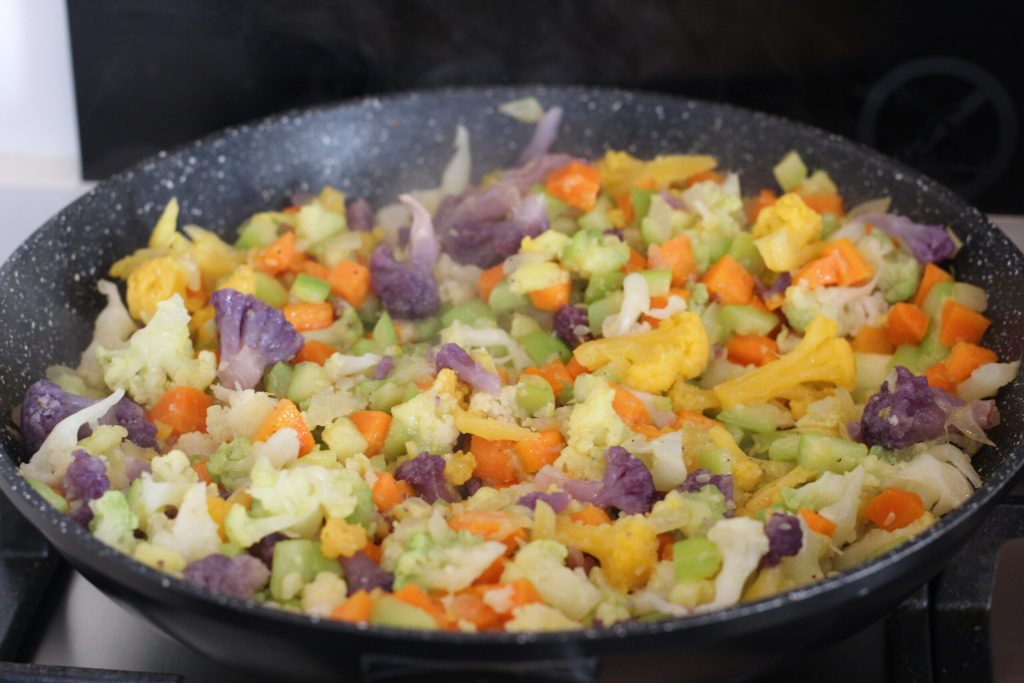 Pour préparer les lasagnes végétariennes aux courgettes, carottes et brocolis, commencez par préparer les légumes. Lavez les brocolis — j’ai utilisé des petites têtes de brocoli colorées : orange, blanches, vertes et violettes — et faites-les cuire dans de l’eau salée pendant environ 15 minutes. Lorsqu’elles sont tendres, égouttez-les et séparez-les en petites têtes. Lavez bien les courgettes et les carottes, épluchez-les et coupez-les en petits dés. Émincez l’oignon jaune. Dans une grande poêle, faites revenir de l’huile d’olive extra vierge avec l’oignon, les courgettes et les carottes ; faites bien cuire les légumes pendant environ 15 minutes à feu moyen, en les remuant de temps en temps et en les assaisonnant de sel et de poivre.