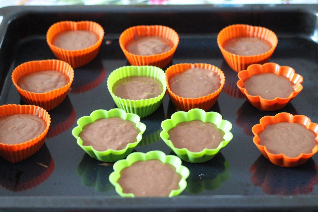 Prenez maintenant une plaque de cuisson et disposez dessus les moules à muffins, j’ai utilisé ceux en silicone. Remplissez les moules avec la préparation jusqu’à trois quarts, il devrait y avoir environ 12 moules. Pendant ce temps, préchauffez le four statique à 180 degrés et faites-les cuire pendant environ 15 minutes. Pour ne pas vous tromper, faites toujours le test du cure-dent (prenez un cure-dent et plongez-le à l’intérieur pour voir si le muffin est cuit, si la préparation reste collée, cela signifie qu’ils ne sont pas encore cuits).