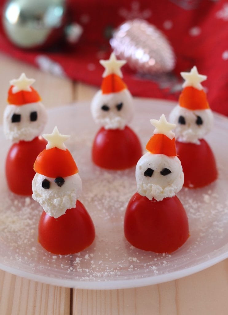 Les Pères Noël avec des tomates et de la mozzarella sont des amuse-bouches très simples, spectaculaires et très jolis à présenter sur les tables pendant les fêtes de Noël. Ils sont vraiment faciles et si vous le souhaitez, vous pouvez les préparer avec vos enfants ! Ils s’amuseront beaucoup ! Si les tomates piccadilly vous paraissent trop grandes pour réaliser le corps du Père Noël, vous pouvez utiliser des petites tomates cerises. Pour faire les petites étoiles de décoration, vous pouvez utiliser du fromage fumé scamorza qui ajoutera une touche de saveur en plus, ou un fromage comme l’edam.