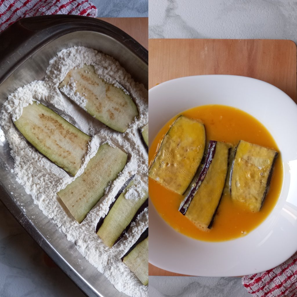 Prenez deux assiettes ou deux bols, dans une assiette plate mettez la farine et dans l’assiette creuse, les œufs battus avec une pincée de sel. Passez les aubergines d’abord dans la farine, puis dans l’œuf battu.