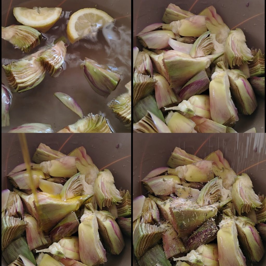 Coupez les artichauts en quatre morceaux, avec la pointe du couteau incisez la partie fibreuse en essayant de retirer également les feuilles attachées. Mettez les artichauts 10 minutes dans de l’eau et du citron pour éviter qu’ils noircissent. Égouttez l’eau et retirez les tranches de citrons, assaisonnez les artichauts avec huile, sel et origan. Mélangez et mettez de côté.
