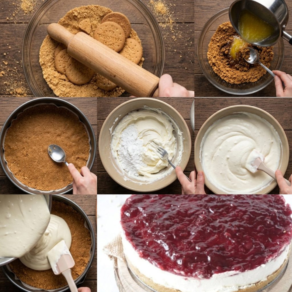 La préparer est vraiment simple : la base croustillante est faite de biscuits et de beurre, puis on obtient une crème veloutée avec du mascarpone, de la crème et du fromage à tartiner ; pour décorer on utilise de la confiture de fraises et, si tu veux, tu peux ajouter quelques rosettes de crème fouettée sur le dessus. Bref, il est pratiquement impossible de résister à cette gourmandise.