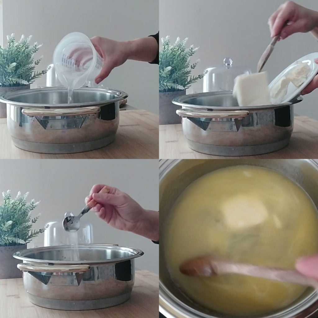 Préparer la pâte à choux est vraiment très simple et pas aussi compliqué que cela pourrait sembler. Prenez une casserole à fond épais, mettez l’eau, le beurre et une pincée de sel et portez à ébullition.