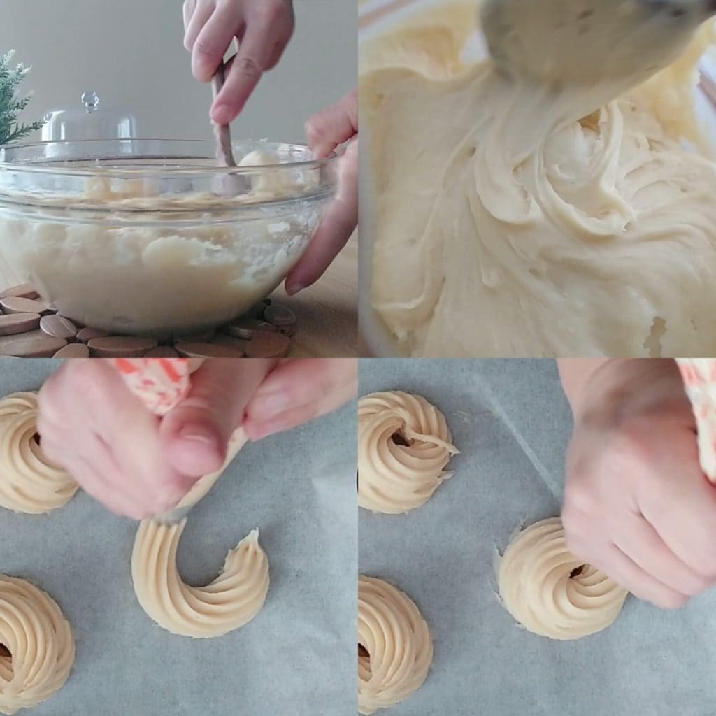 Travaillez le mélange jusqu’à ce que tous les ingrédients soient bien amalgamés. Mettez la pâte à choux dans une poche à douille avec une grande douille étoile et sur une plaque beurrée, formez des cercles.
