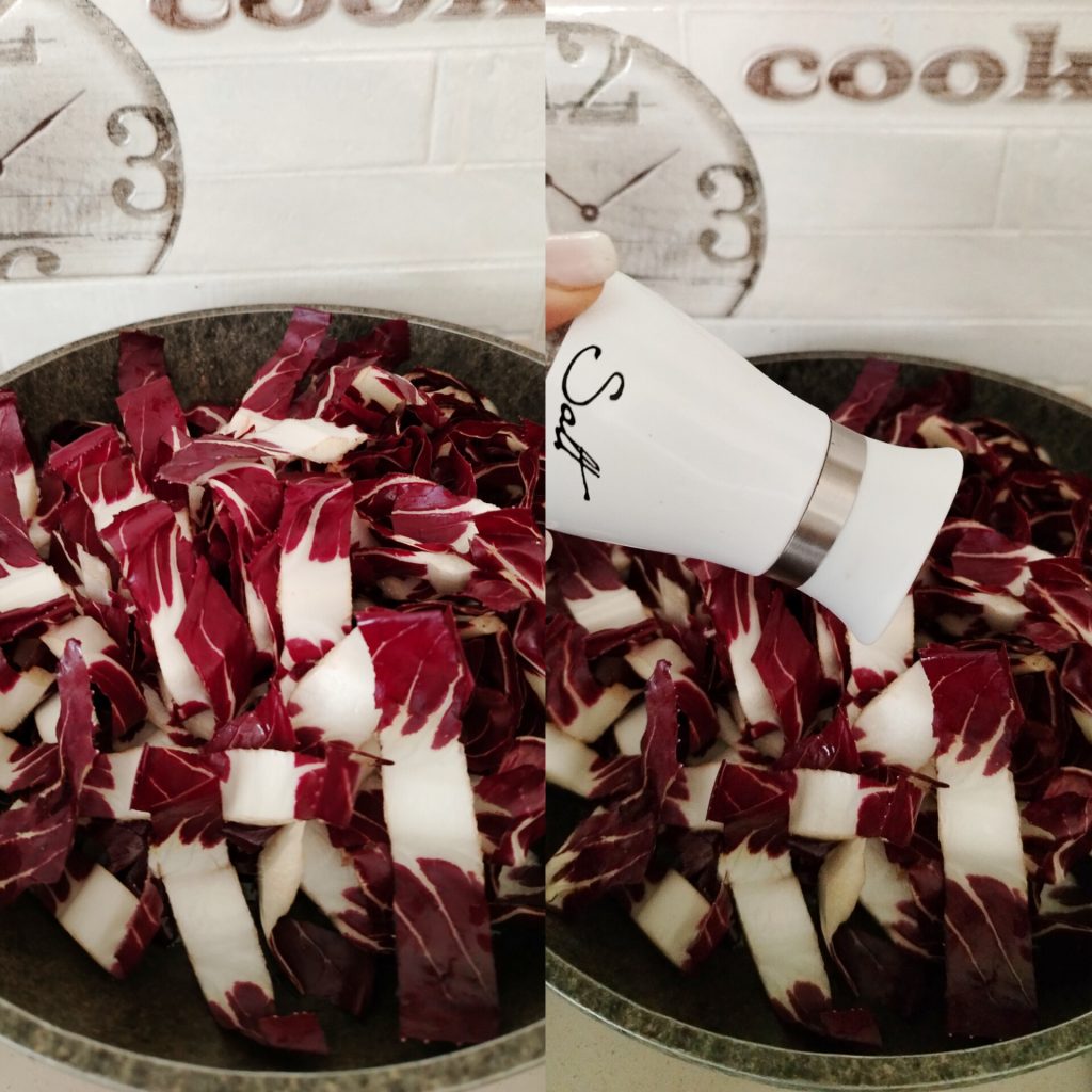 Dès que l’oignon commence à rissoler, ajoutez le radicchio. Salez et laissez cuire à feu moyen pendant 5 minutes, en remuant avec une cuillère en bois.