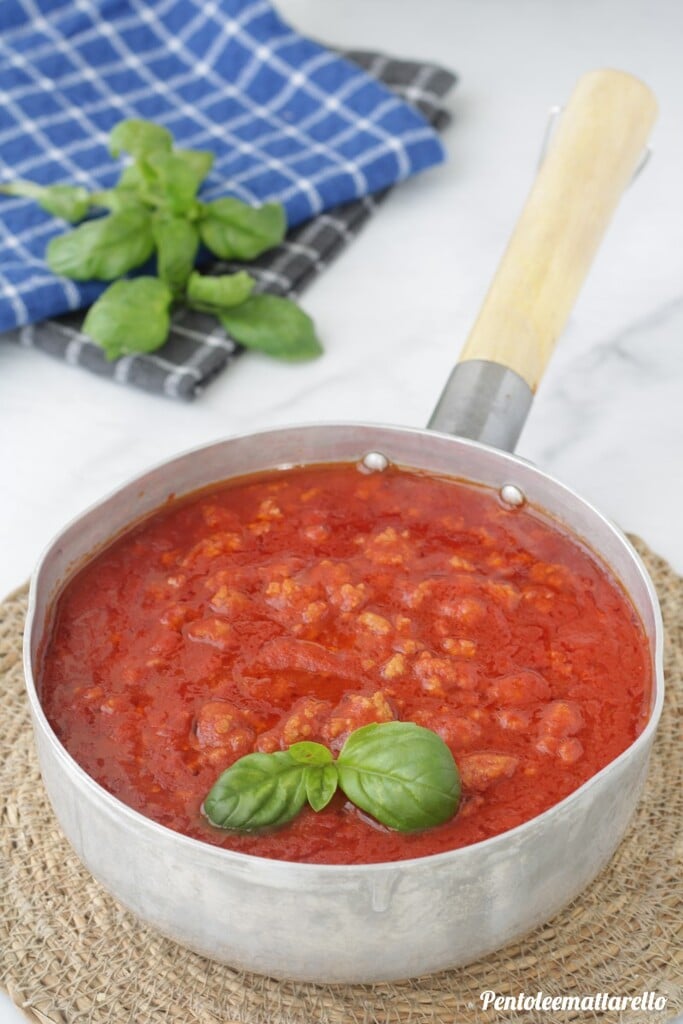 Lorsque la viande a pris couleur, déglacez avec le vin blanc et laissez évaporer quelques minutes. À ce stade, ajoutez la purée de tomates, ajustez le sel, couvrez et laissez cuire à feu doux pendant une heure.