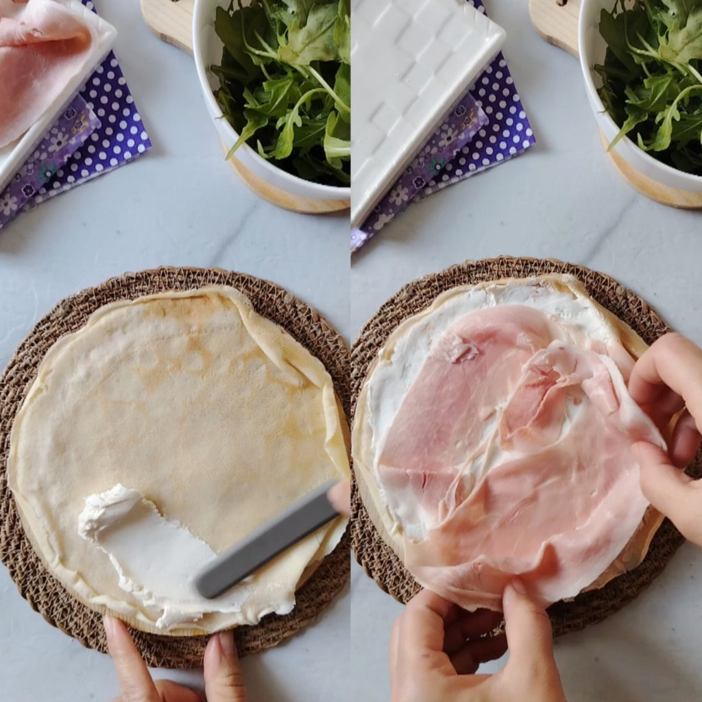 Étalez la crêpe sur un plan de travail, étalez avec une spatule ou un couteau une couche de fromage à tartiner sur toute la surface, ajoutez les tranches de jambon cuit sur le fromage, en couvrant bien toute la crêpe.